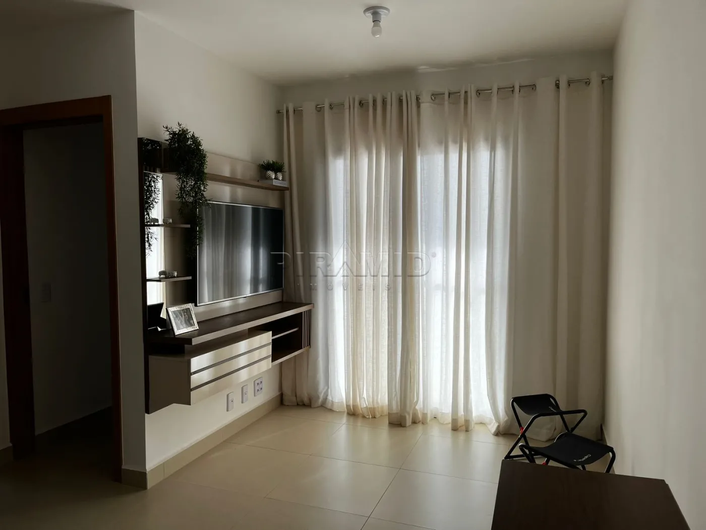 - Sala ampla, com sofá, painel e TV, mesa com 4 cadeiras, aparador e cortinas;