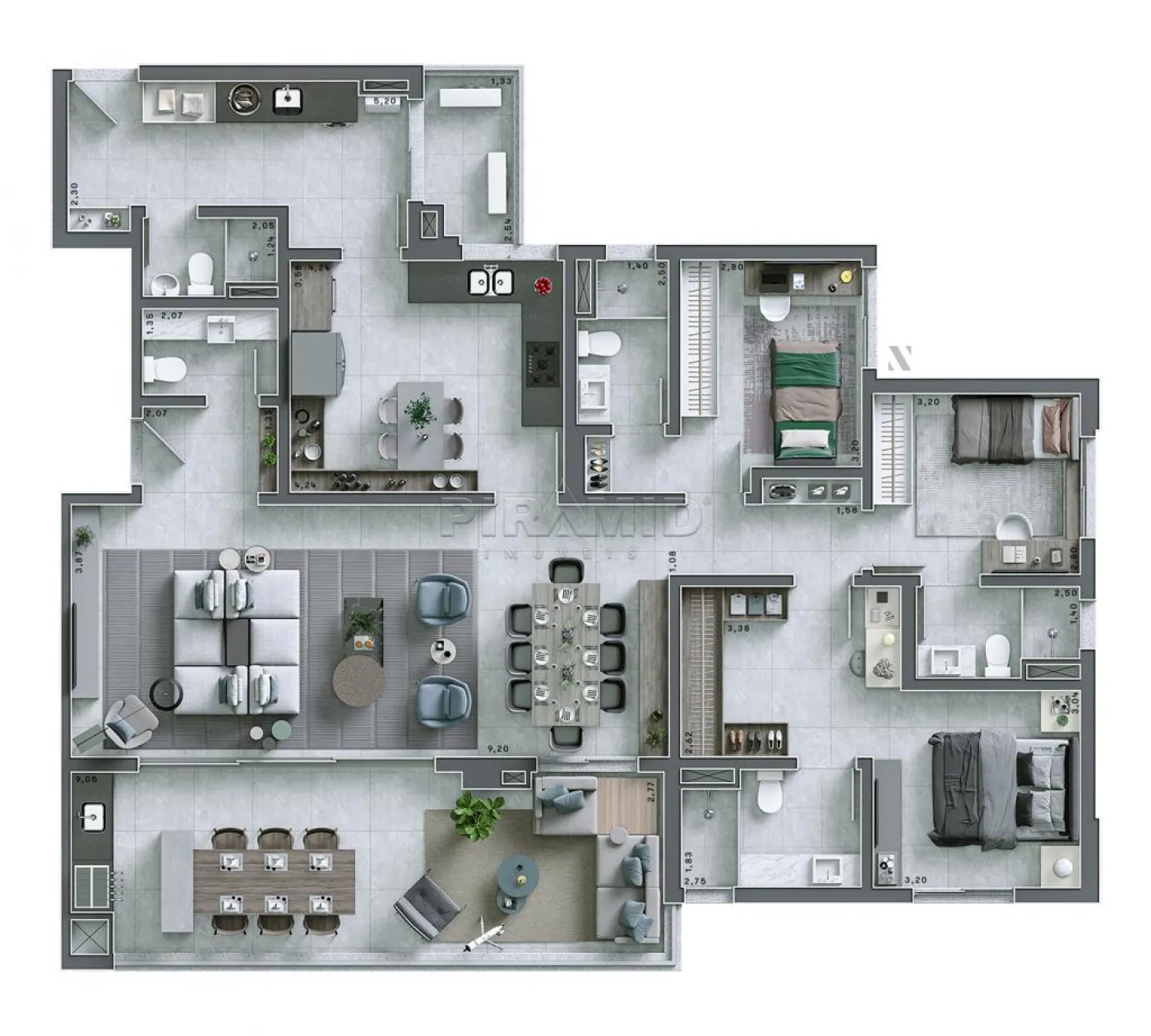 3 suítes, sendo 1 master com closet e/ou 4 quartos, sendo 2 suítes, banheiro social, lavabo, sala para 2 ambientes, varanda gourmet, cozinha ampla, janelas automatizadas, opção de 2 ou 3 vagas de garagem.