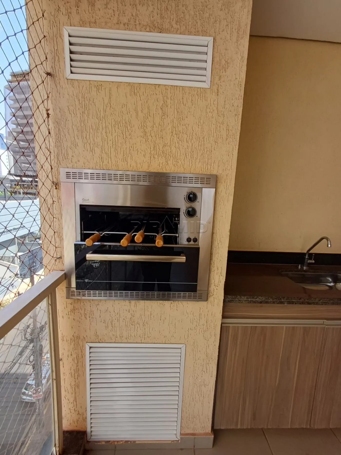 - Varanda gourmet com churrasqueira e tela de proteção;