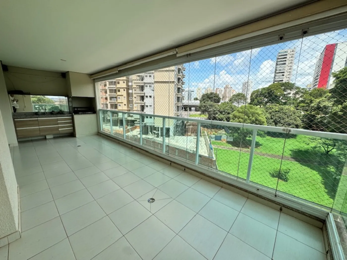 - varanda gourmet com fechamento em vidro, churrasqueira