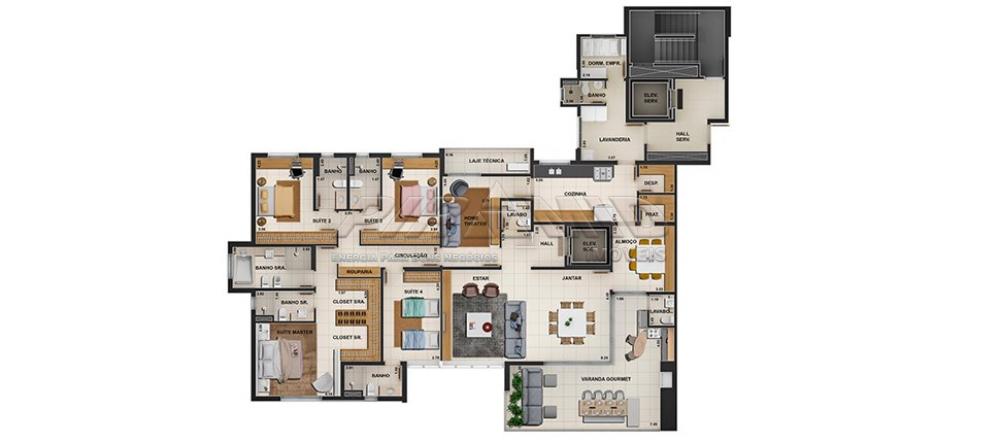 4 suítes, sendo 1 master, sala 2 ambientes, Home Theater, lavabo, ampla varanda gourmet em L, cozinha c/ espaço p/ refeições e despensas, AS, dependência de serviço, área técnica, 4 vagas de garagem.
