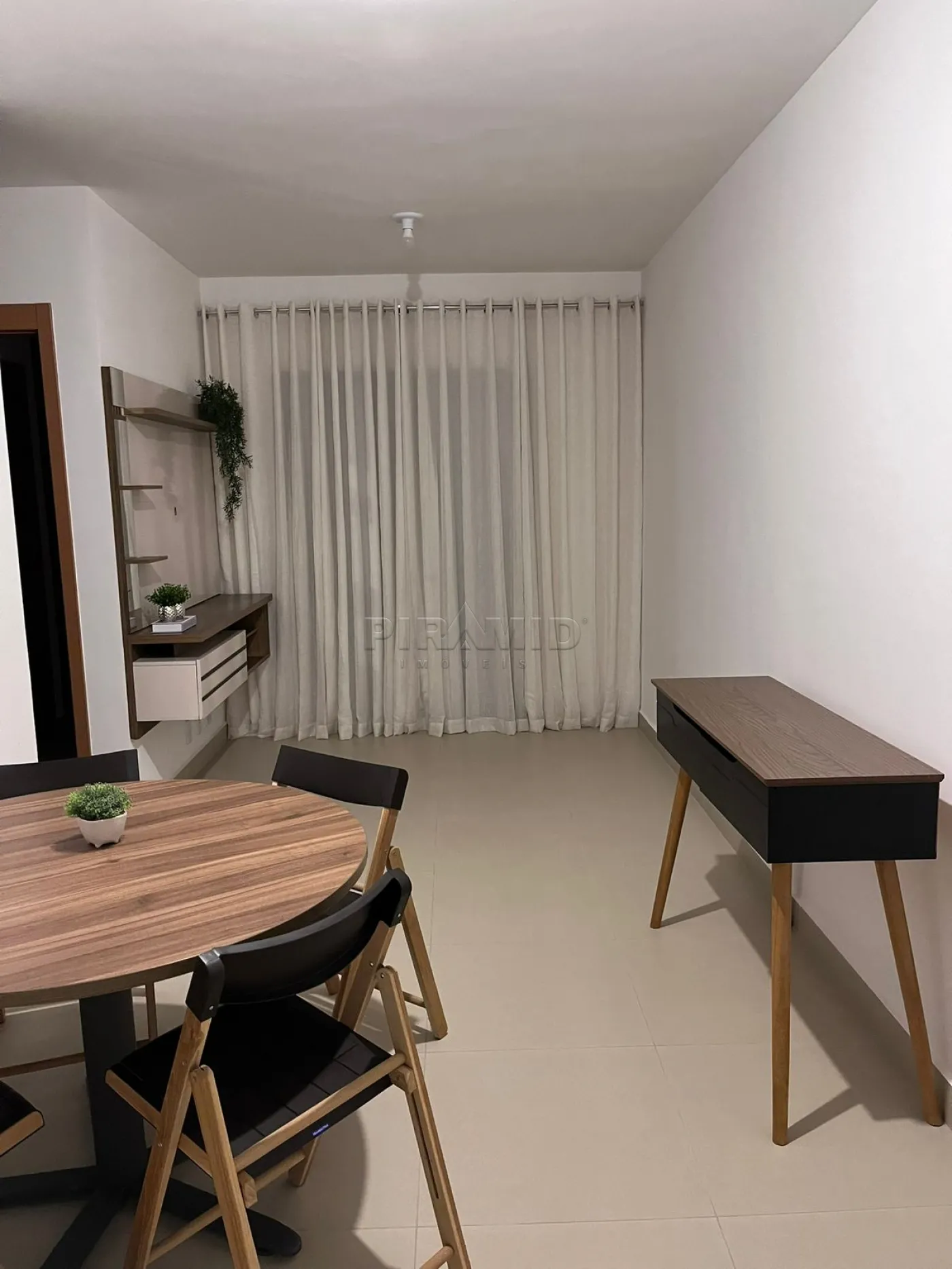 - Sala ampla, com sofá, painel e TV, mesa com 4 cadeiras, aparador e cortinas;