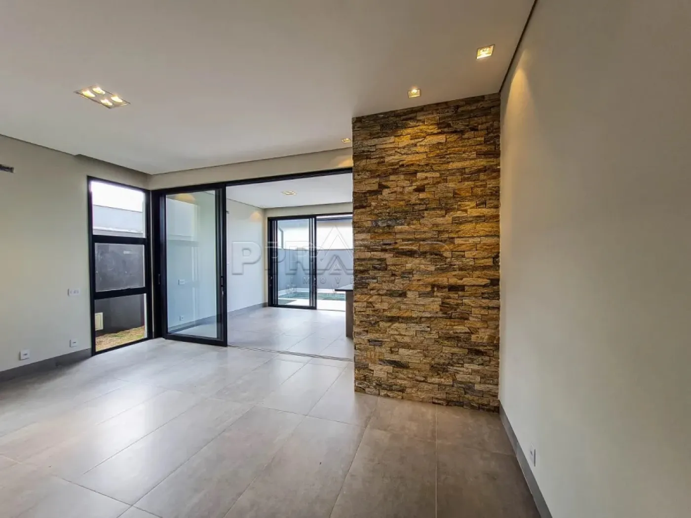 - Revestimento de pedra madeira serrada na sala;